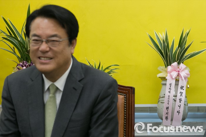 (서울=포커스뉴스) 정진석 새누리당 신임 원내대표가 4일 오후 서울 여의도 국회에서 노회찬 정의당 원내대표를 예방, 면담을 하고 있는 모습 뒤로 현기환 청와대 정무수석이 노 원내대표에게 보낸 축하난이 보이고 있다.