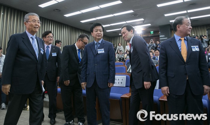 (서울=포커스뉴스) 4일 오후 서울 여의도 국회에서 열린 더불어민주당 20대 국회 1기 원내대표 선출을 위한 당선자 총회에 참석한 김종인 비대위 대표가 원내대표 후보들과 인사한 뒤 자리로 향하고 있다. 왼쪽부터 김 대표, 우원식, 민병두, 노웅래, 우상호, 강창일 후보.