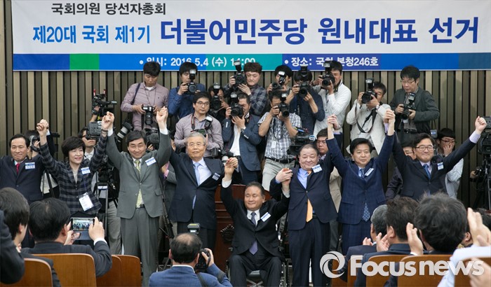 (서울=포커스뉴스) 4일 오후 서울 여의도 국회에서 열린 더불어민주당 20대 국회 1기 원내대표 선출을 위한 당선자 총회에 참석한 지도부와 원내대표 후보들이 취재진을 향해 포즈를 취하고 있다. 왼쪽부터 우상호 후보, 김영주 선거관리위원장, 이종걸 원내대표, 김종인 비대위 대표, 이상민, 강창일, 노웅래, 우원식 후보.