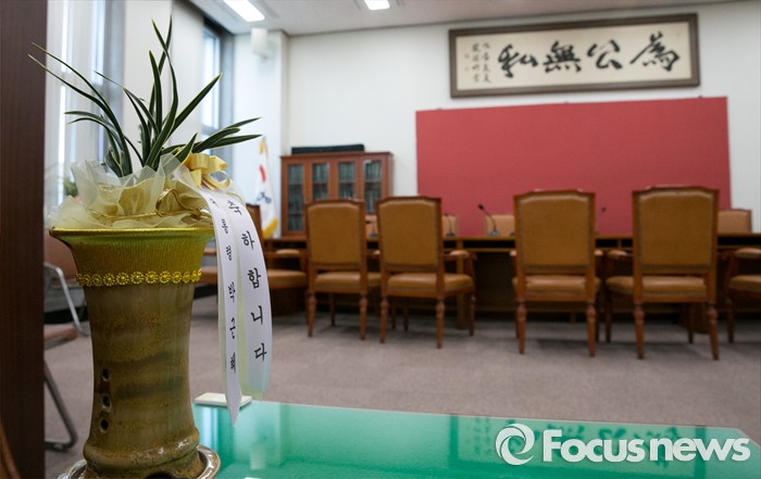(서울=포커스뉴스) 4일 오후 서울 여의도 국회 새누리당 원내대표실에 정진석 신임 원내대표의 당선을 축하하는 박근혜 대통령의 난이 놓여 있다.