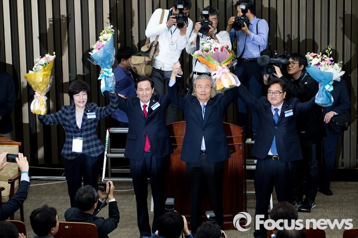 (서울=포커스뉴스) 우상호(왼쪽 두 번째) 더불어민주당 의원이 4일 오후 서울 여의도 국회에서 열린 원내대표선거에서 신임 원내대표로 선출된 뒤 꽃다발을 들고 사진촬영을 하고 있다.
