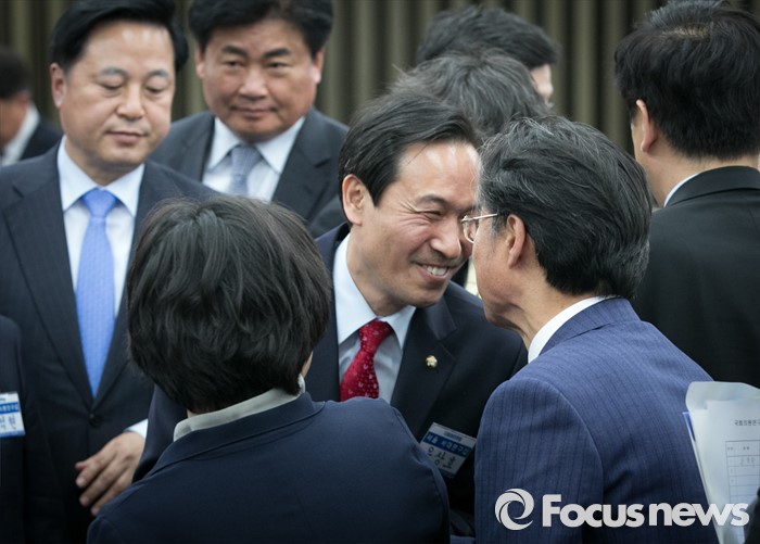 (서울=포커스뉴스) 4일 오후 서울 여의도 국회에서 열린 더불어민주당 20대 국회 1기 원내대표 선출을 위한 당선자 총회에서 선출된 우상호 신임 원내대표가 총회를 마친 뒤 동료 의원들의 축하를 받고 있다.