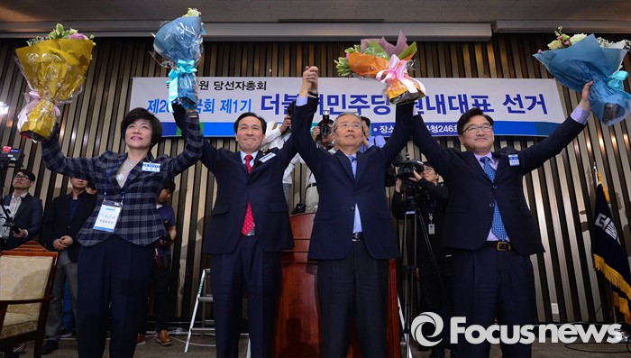 (서울=포커스뉴스) 4일 오후 서울 여의도 국회에서 더불어민주당 20대 국회 1기 원내대표 선출을 위한 당선자 총회에 참석한 김종인 비대위 대표와 우상호 신임 원내대표가 취재진을 향해 포즈를 취하고 있다. 왼쪽부터 김영주 선거관리위원장, 우 신임 원내대표, 김 대표, 경쟁 후보였던 우원식 의원.