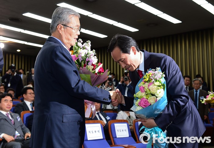 | △ 김종인 축하받는 우상호 |