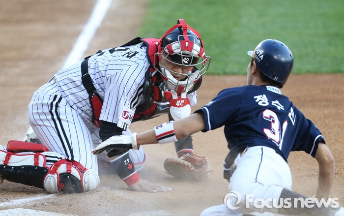 (서울=포커스뉴스) 4일 서울 잠실구장에서 열린 2016 프로야구 두산-LG 경기 1회초 1사 2루에서 두산 2루주자 정수빈이 민병헌의 좌전안타때 홈까지 뛰어들다 LG 포수 정상호에게 태그아웃되고 있다.