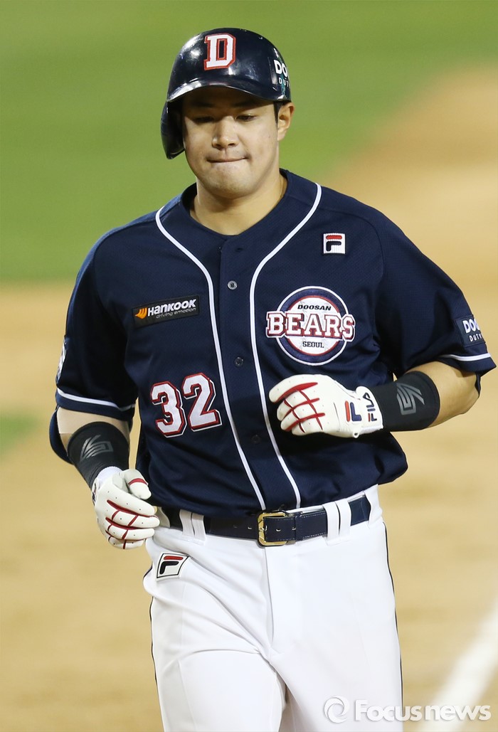 (서울=포커스뉴스) 4일 서울 잠실구장에서 열린 2016 프로야구 두산-LG 경기 9회초 2사후 두산 김재환이 우월 솔로 홈런을 치고 3루를 돌아 홈인하고 있다.