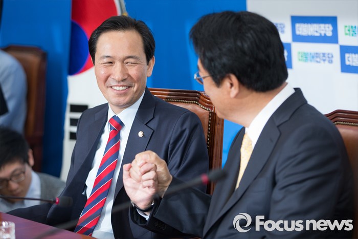 (서울=포커스뉴스) 정진석(오른쪽) 새누리당 신임 원내대표가 5일 오전 서울 여의도 국회 더불어민주당 원내대표실을 예방하여 우상호 더불어민주당 원내대표와 손을 잡고 있다.