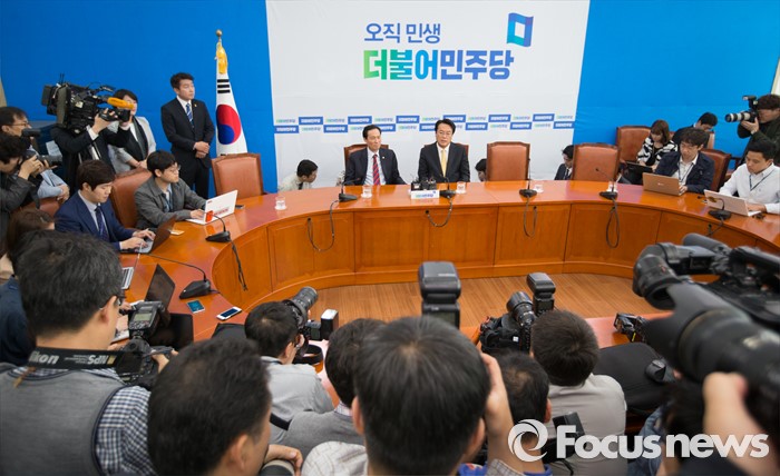 (서울=포커스뉴스) 정진석(왼쪽) 새누리당 신임 원내대표가 5일 오전 서울 여의도 국회 더불어민주당 원내대표실을 예방하여 우상호 더불어민주당 원내대표와 대화하고 있다.