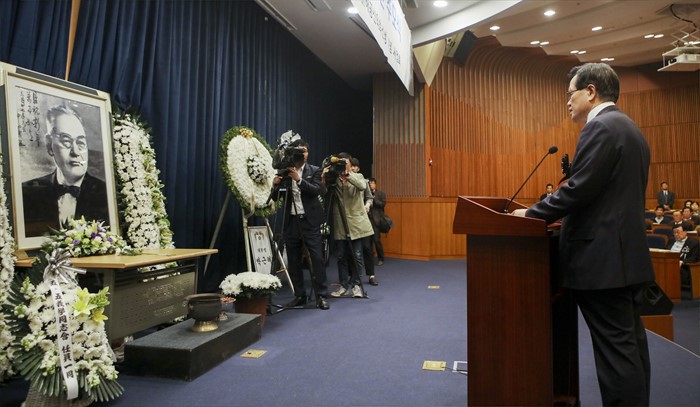 (서울=포커스뉴스) 정의화 국회의장이 5일 오전 서울 여의도 국회 헌정기념관에서 열린 해공 신익희 선생 60주년 추도식에 참석해 추도사를 하고 있다. <사진제공=국회>