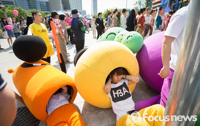 (서울=포커스뉴스) 어린이날을 맞아 5일 오후 서울 영동대로 일대에서 열린 '2016 C-페스티벌'에서 캐릭터 인형을 입은 한 참가자가 인형탈을 벗고 휴식을 취하고 있다.