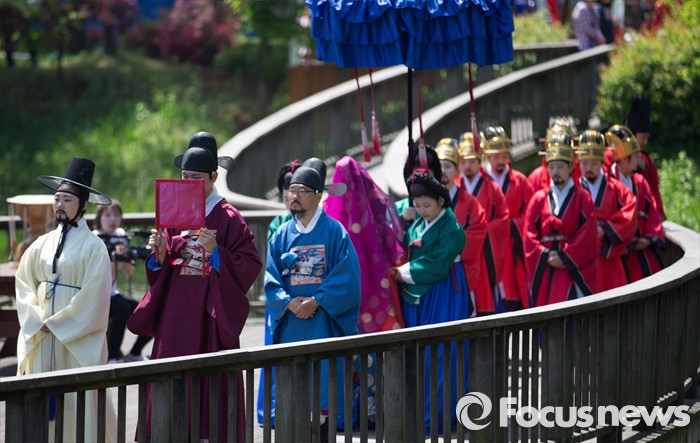 (서울=포커스뉴스) 7일 오전 서울 구로구 궁동저수지생태공원에서 '정선옹주 시집가는 날' 참가자들이 전통혼례를 재현하고 있다. 정선옹주는 조선 14대 임금인 선조와 후궁 정빈 민씨의 딸이다.