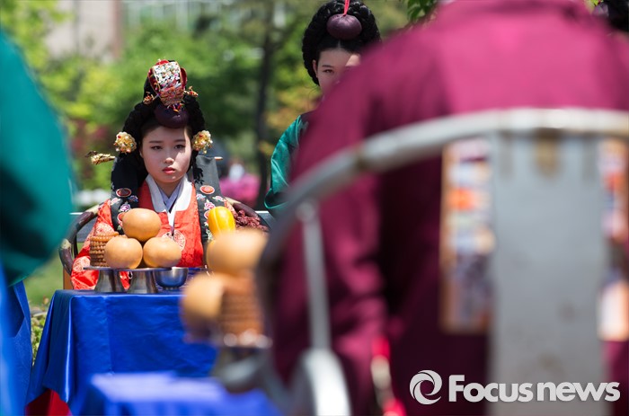 (서울=포커스뉴스) 7일 오전 서울 구로구 궁동저수지생태공원에서 '정선옹주 시집가는 날' 참가자들이 전통혼례를 재현하고 있다. 정선옹주는 조선 14대 임금인 선조와 후궁 정빈 민씨의 딸이다.