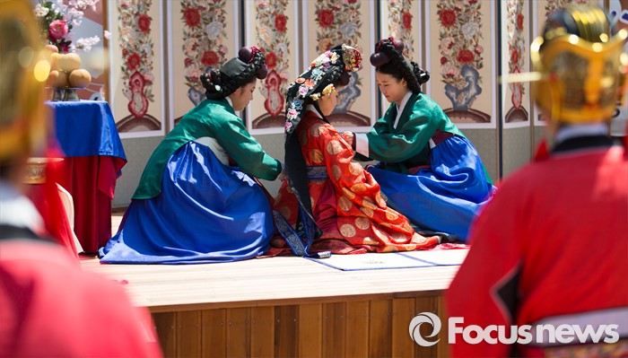 (서울=포커스뉴스) 7일 오전 서울 구로구 궁동저수지생태공원에서 '정선옹주 시집가는 날' 참가자들이 전통혼례를 재현하고 있다. 정선옹주는 조선 14대 임금인 선조와 후궁 정빈 민씨의 딸이다.