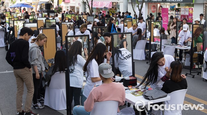 (서울=포커스뉴스) 7일 오후 서울 서대문구 신촌 차없는 거리에서 열린 제1회 신촌 뷰티 페스티벌 '뷰티체어 101' 행사 참가자들이 메이크업과 머리 손질을 받고 있다.