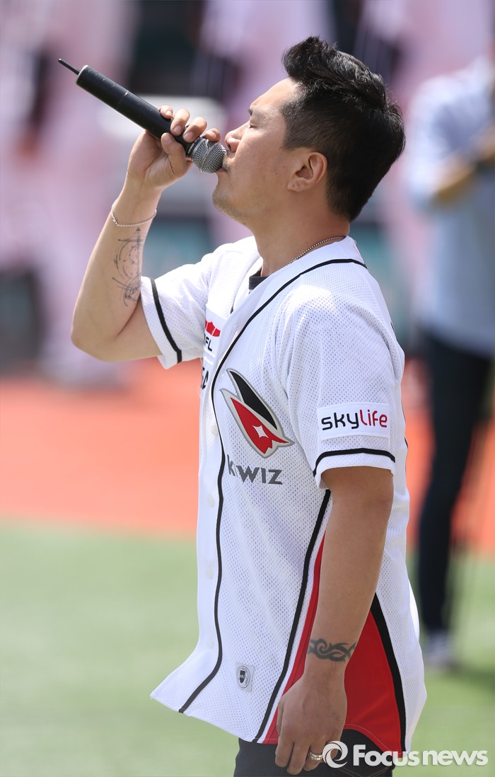 (서울=포커스뉴스) 8일 수원 kt위즈파크에서 열린 2016프로야구 한화-kt 경기에 앞서 가수 JK 김동욱이 애국가를 부르고 있다.