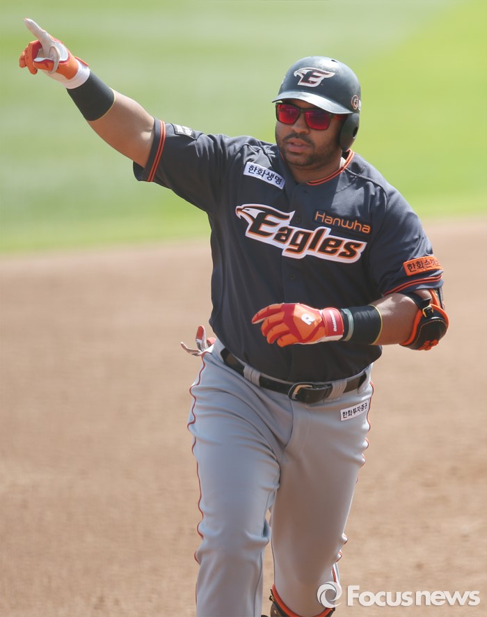 (서울=포커스뉴스) 8일 수원 kt위즈파크에서 열린 2016프로야구 한화-kt 경기 2회초 2사 1,2루에서 한화 로사리오가 좌월 3점 홈런을 치고 베이스를 돌면서 손을 들어 팬들의 환호에 답하고 있다.