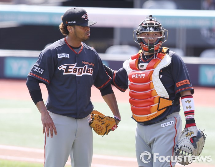 (서울=포커스뉴스) 8일 수원 kt위즈파크에서 열린 2016프로야구 한화-kt 경기에서 2회말 한화 포수 조인성이 박종철 주심의 연속 보크 선언에 열받은 로저스를 진정시키고 있다.