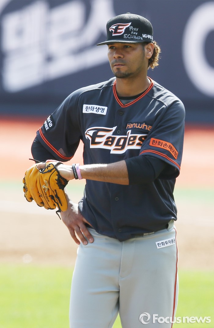(서울=포커스뉴스) 8일 수원 kt위즈파크에서 열린 2016프로야구 한화-kt 경기에서 한화 투수 로저스가 5회말 kt 박경수에게 동점타를 맞고 의기소침해 하고 있다. 모자에는 '에쿠아도르를 위하여'라고 적었다.
