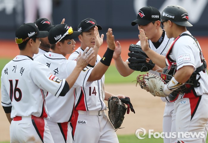 (서울=포커스뉴스) 8일 수원 kt위즈파크에서 열린 2016프로야구 한화-kt 경기에서 한화와의 3연전을 모두 승리로 장식한 kt 선수들이 마운드에 모여 하이파이브를 하고 있다.