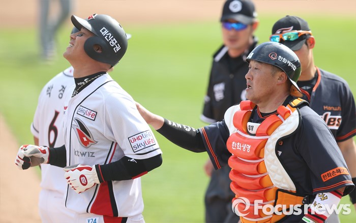 (서울=포커스뉴스) 8일 수원 kt위즈파크에서 열린 2016프로야구 한화-kt 경기 5회말 2사 1,3루에서 kt 1루주자 박경수가 2루 도루를 시도할때 3루주자 김상현이 한화 포수 조인성의 견제에 걸려 태그아웃되고 있다.