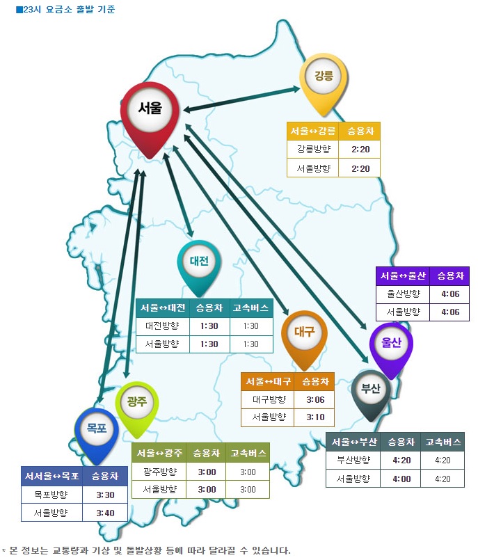 주요도시에서 서울까지 소요되는 시간은 오후 11시 기준 강릉 2시간 20분, 부산 4시간, 광주 3시간, 목포 3시간 40분, 대전 1시간 30분 등이다.
