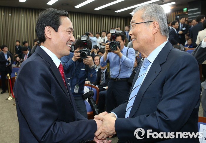 다만 "고민을 해봐야 될 것 같다"며 "협상과정에서 서로 열어놓고 대화하면 답이 나올 것"이라며 협상에 대한 여지를 열어뒀다.지난 4일 오후 서울 여의도 국회에서 더불어민주당 20대 국회 1기 원내대표 선출을 위한 당선자 총회를 마친 뒤 김종인(오른쪽) 비대위 대표와 우상호 신임 원내대표가 악수하고 있다. 2016.05.04 강진형 기자