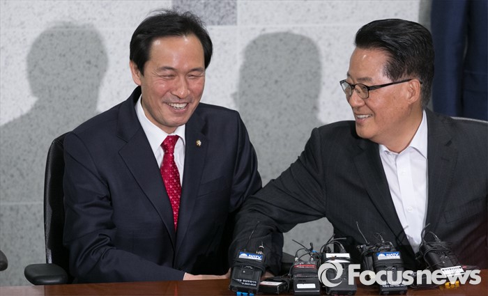 (서울=포커스뉴스) 우상호(왼쪽) 더불어민주당 원내대표가 9일 오전 서울 여의도 국회 의원회관에서 박지원 국민의당 원내대표를 예방, 면담을 하고 있다.
