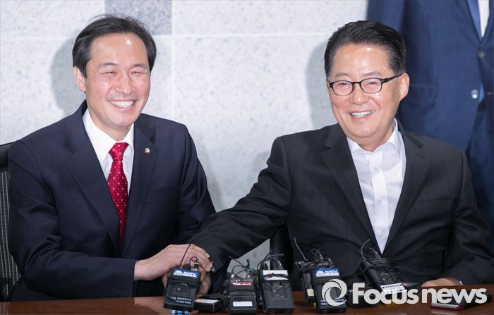 (서울=포커스뉴스) 우상호(왼쪽) 더불어민주당 원내대표가 9일 오전 서울 여의도 국회 의원회관에서 박지원 국민의당 원내대표를 예방, 면담을 하고 있다.