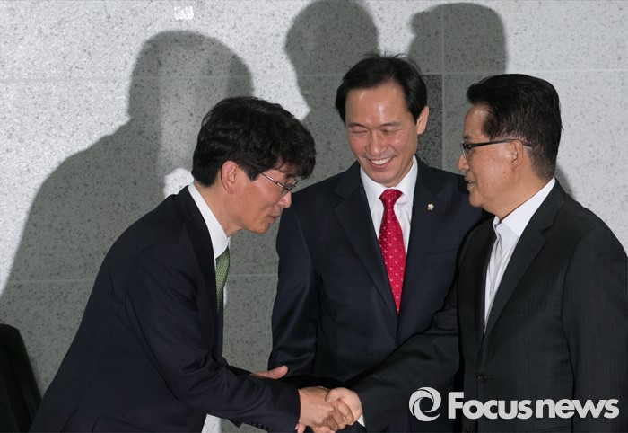 (서울=포커스뉴스) 우상호(가운데) 더불어민주당 원내대표가 9일 오전 서울 여의도 국회 의원회관에서 박지원(오른쪽) 국민의당 원내대표를 예방, 인사를 하고 있다. 왼쪽은 박완주 더민주 원내수석부대표.