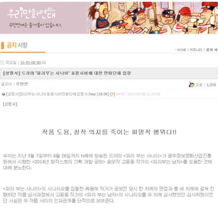'피리부는 사나이' 표절 논란 관련 방송사인 tvN측은 "시시비비가 가려지기 전까지 말할 수 없다. 소송 결과가 나오면 말할 수 있을 것 같다"고 입장을 밝혔다.우리만화연대 홈페이지에 게시된 성명서.<사진출처=우리만화연대>