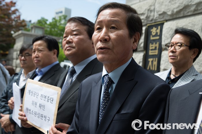 (서울=포커스뉴스) 9일 오전 서울 종로구 헌법재판소 앞에서 정기섭 개성공단기업협회 회장과 개성공단 비상대책위원회 관계자들이 정부의 개성공단 전면중단 조치에 대한 위헌심판 청구서 제출에 앞서 기자회견을 하고 있다.