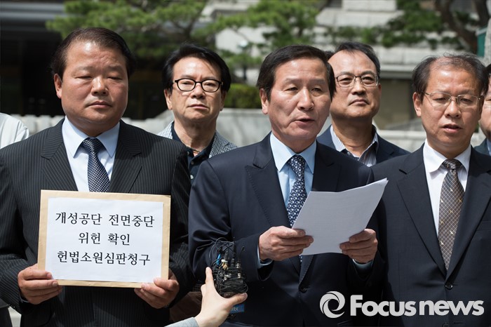 (서울=포커스뉴스) 9일 오전 서울 종로구 헌법재판소 앞에서 정기섭(오른쪽 첫번째) 개성공단기업협회 회장과 개성공단 비상대책위원회 관계자들이 정부의 개성공단 전면중단 조치에 대한 위헌심판 청구서 제출에 앞서 기자회견을 하고 있다.