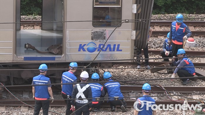 (서울=포커스뉴스) 9일 오전 서울 노량진역에서 경인선 급행열차가 탈선해, 코레일 직원들이 복구작업을 벌이고 있다. 이 사고로 구로역에서 용산역까지 5개구간 급행열차의 운행이 중단됐으며, 부상자는 없는 것으로 알려졌다. <사진=포커스뉴스 영상 캡쳐>