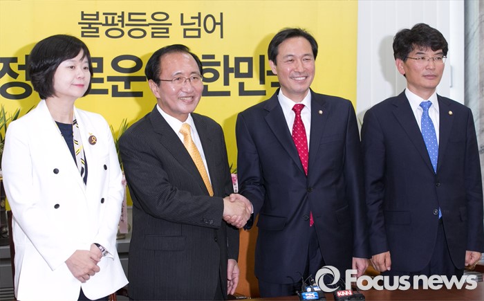 (서울=포커스뉴스) 우상호 더불어민주당 원내대표가 9일 오전 서울 여의도 국회에서 노회찬 정의당 원내대표를 예방, 취재진을 향해 포즈를 취하고 있다. 왼쪽부터 이정미 정의당 비례대표 당선인, 노회찬 원내대표, 우상호 더불어민주당 원내대표, 박완주 원내수석부대표.