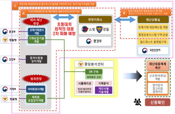 첫번째 사업은 기체분자 식별‧분석기술 개발(489억원, 7년) 사업으로 경찰청(주관), 미래부, 환경부, 안전처, 산업부가 참여한다. 재난‧범죄‧테러 현장에서 발생하는 각종 유해가스의 탐지가 가능한 이동형 기체 포집장치 개발과 통합 운용시스템 구축을 통해 국민 피해를 최소화하는 것이 목적이다.