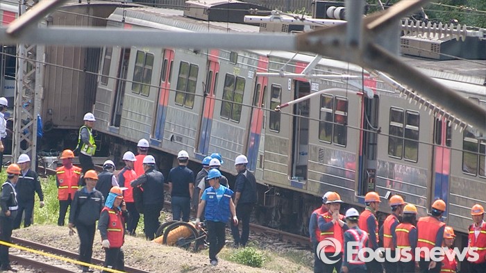 (서울=포커스뉴스) 9일 오전 서울 노량진역에서 경인선 급행열차가 탈선해, 코레일 직원들이 복구작업을 벌이고 있다. 이 사고로 구로역에서 용산역까지 5개구간 급행열차의 운행이 중단됐으며, 부상자는 없는 것으로 알려졌다. <사진=포커스뉴스 영상 캡쳐>