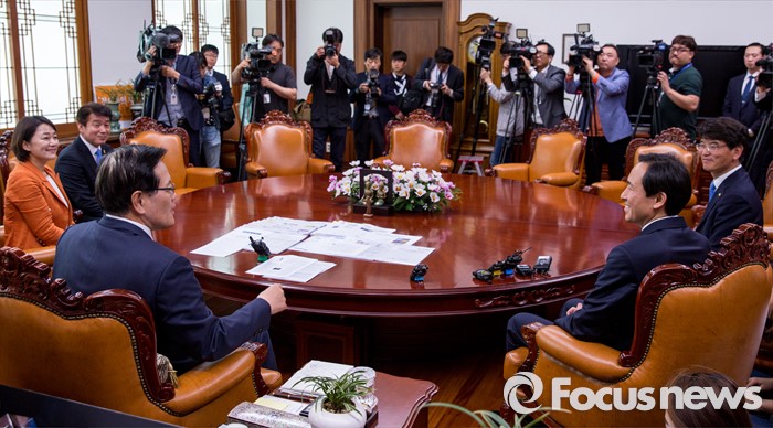 (서울=포커스뉴스) 정의화(왼쪽) 국회의장과 우상호 더불어민주당 원내대표를 비롯한 신임원내대표단이 9일 오전 서울 여의도 국회에서 면담 하고 있다.