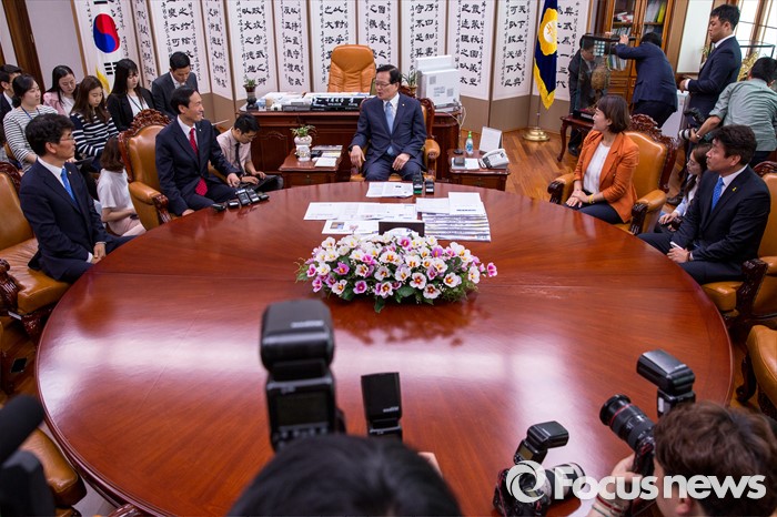 (서울=포커스뉴스) 정의화 국회의장과 우상호 더불어민주당 원내대표를 비롯한 신임원내대표단이 9일 오전 서울 여의도 국회에서 면담 하고 있다.