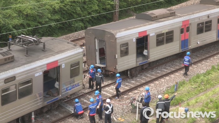 (서울=포커스뉴스) 9일 오전 서울 노량진역에서 경인선 급행열차가 탈선해, 코레일 직원들이 복구작업을 벌이고 있다. 이 사고로 구로역에서 용산역까지 5개구간 급행열차의 운행이 중단됐으며, 부상자는 없는 것으로 알려졌다. <사진=포커스뉴스 영상 캡쳐>