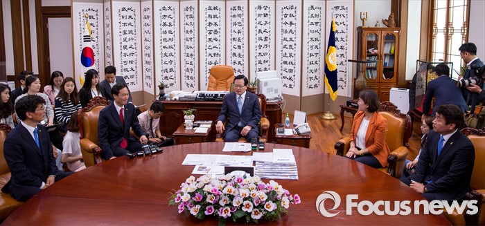 (서울=포커스뉴스) 정의화 국회의장과 우상호 더불어민주당 원내대표를 비롯한 신임원내대표단이 9일 오전 서울 여의도 국회에서 면담 하고 있다.