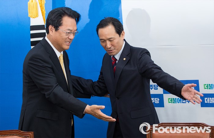 법사위원장에 대해서는 "법사위원장은 지난 19대 국회에서 정부여당이 법안을 워낙 거세게 밀어붙였기 때문에 안전판을 만들려고 했던 것"이라며 "박근혜 대통령이 국정 운영 방식을 변화할 가능성이 높지 않다고 보고 법사위원장은 야당이 가져야 하는게 아닌가"라고 말했다정진석(왼쪽) 새누리당 원내대표가 5일 오전 서울 여의도 국회 더불어민주당 원내대표실을 예방하여 우상호 더불어민주당 원내대표와 서로 자리를 양보하고 있다. 2016.05.05 김흥구 기자