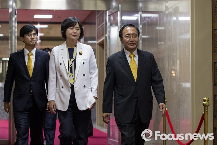 (서울=포커스뉴스) 노회찬(오른쪽) 정의당 원내대표를 비롯한 신임 원내대표단이 9일 오후 서울 여의도 국회에서 정의화 국회의장을 예방하기 위해 의장실로 향하고 있다.