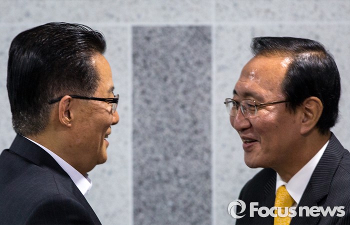 (서울=포커스뉴스) 박지원(왼쪽) 국민의당 원내대표와 노회찬 정의당 원내대표가 9일 오후 서울 여의도 국회에서 면담에 앞서 인사하고 있다.