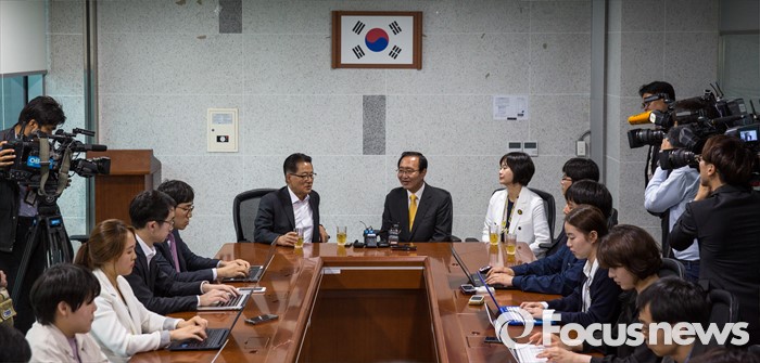 (서울=포커스뉴스) 박지원(왼쪽) 국민의당 원내대표와 노회찬 정의당 원내대표가 9일 오후 서울 여의도 국회에서 면담하고 있다.