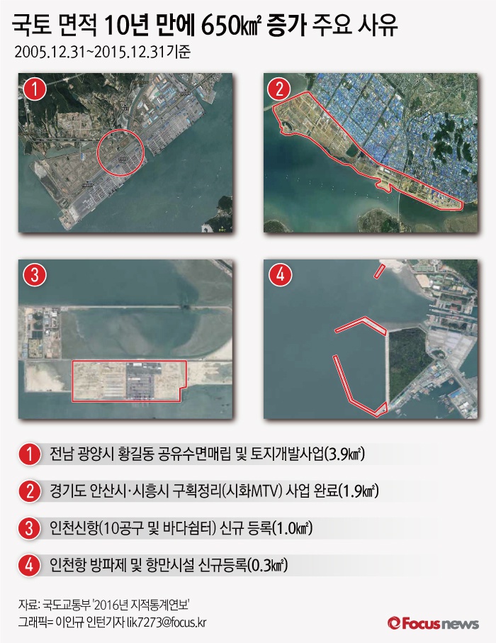 (서울=포커스 뉴스) 국토교통부가 10일 발간하는 '2016년 지적통계연보'에 따르면 우리나라 국토면적이 10년 동안 여의도 면적의 224배인 650㎢ 증가한것으로 나타났다.
