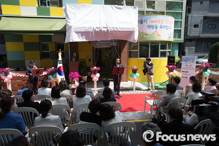 (서울=포커스뉴스) 9일 오후 서울 성동구 송정햇살어린이집에서 열린 서울시 1000번째 국공립어린이집 개원식에서 박원순 서울시장이 축사를 하고 있다.