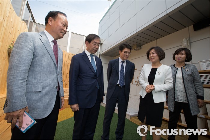 (서울=포커스뉴스) 박원순(왼쪽 두번째) 서울시장과 정원오 성동구청장이 9일 오후 서울 성동구 송정햇살어린이집에서 열린 서울시 1000번째 국공립어린이집 개원식을 마친 뒤 내부시설을 둘러보고 있다.