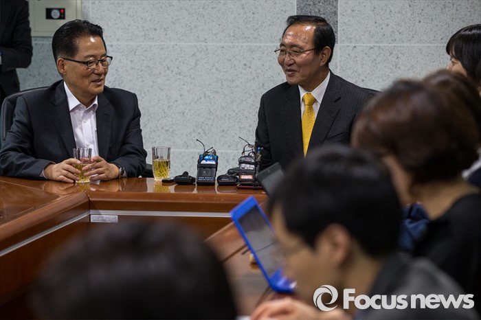 (서울=포커스뉴스) 박지원(왼쪽) 국민의당 원내대표와 노회찬 정의당 원내대표가 9일 오후 서울 여의도 국회에서 면담하고 있다.