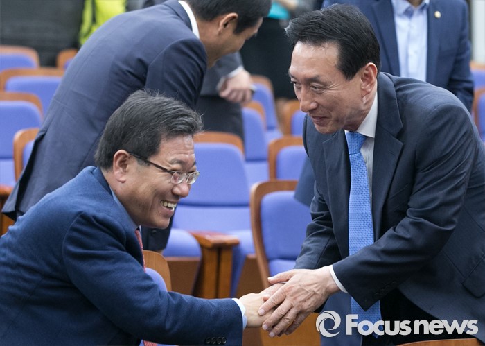 (서울=포커스뉴스) 9일 오후 서울 여의도 국회에서 열린 새누리당 20대 총선 당선자 총회에 참석한 김석기(오른쪽), 윤상직 당선인이 인사하고 있다.