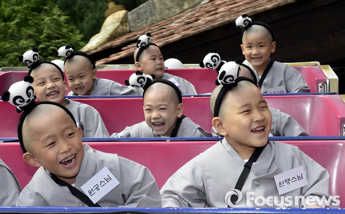 (용인=포커스뉴스) 9일 오전 경기도 용인시 에버랜드에서 동자승들이 놀이기구를 타며 즐거운 시간을 보내고 있다.